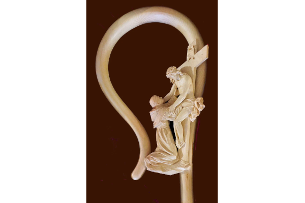 Für das Stift Heiligenkreuz wurde ein Abtstab als Zirbenholz geschnitzt. In der Krümme ist eine Amplexus - Darstellung (der Gekreuzigte löst seine Arme vom Kreuz und umarmt den Heiligen Bernhard; eine Kernszene zisterziensischer Spiritualität). In die Rückseite der Kehre wurden Wappen und der Wahlspruch in den Stab geschnitzt.